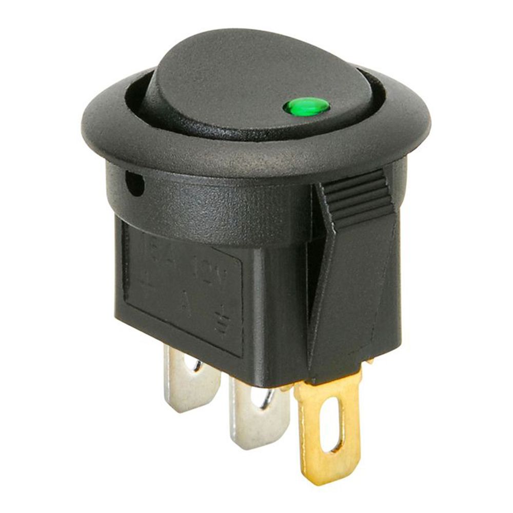 High quality SPST illuminated round rocker switch with an integrated green LED that lights up to indicate ON position. Made of a tough polyamide 66 thermoplastic providing high strength and a high resistance to temperature in a lightweight module, ensuring longevity and reliability.
