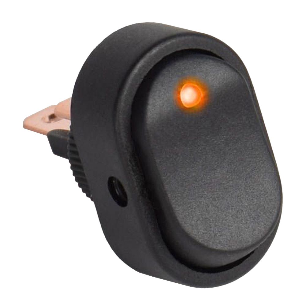 High quality SPST illuminated round rocker switch with an integrated amber LED that lights up to indicate ON position. Made of a tough polyamide 66 thermoplastic providing high strength and a high resistance to temperature in a lightweight module, ensuring longevity and reliability.